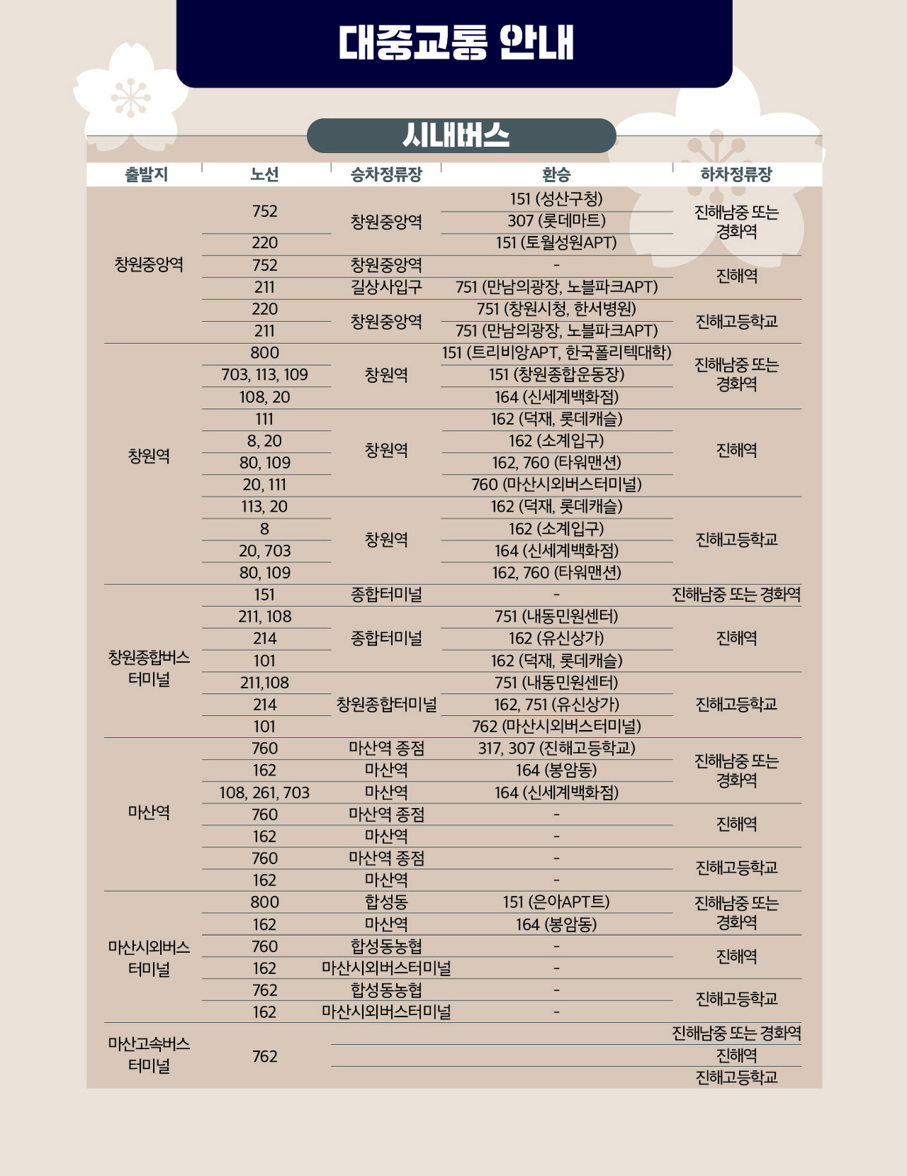 [진해해양공원]→[진해명동]→[경화역]→[해군사관학교/11부두]→[중앙시장]→[여좌천]→(진해-마산-창원) - 숨겨진 벚꽃 핫플레이스