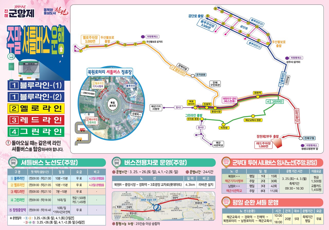 해군교육사→경화역→진해역→북원로터리→남원로터리→해군교육사 10:00~18:00 운행 (20분간격) 총 5대 운영